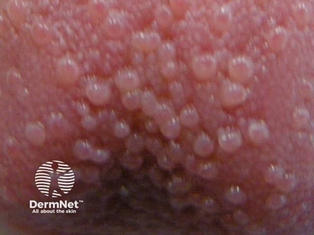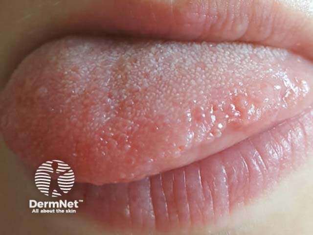 Fungiform papillae can become obvious in a number of conditions, the most well recognised of which is the ‘strawberry tongue’ of scarlet fever, and most recently as the most common oral manifestation of COVID-19.