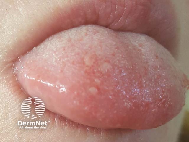 Eruptive lingual papillitis is a systemic illness often associated with fever and lymph gland enlargement. The onset is sudden. An affected child may be reluctant to eat and produces excessive saliva. The tongue shows enlarged inflamed fungiform papillae on the tip and the sides of the tip but not the top. These may look like pustules. Angular cheilitis may be seen.