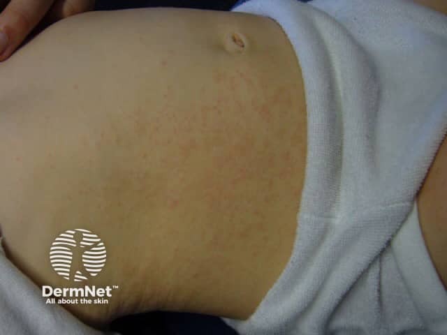 Sometimes other features of viral infection occur at the onset of the rash, such as a fever, sore throat, cold, vomiting, and/or diarrhoea. The lymph glands in the armpits and groins may be enlarged.